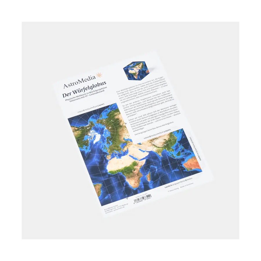Mit diesem Würfelglobus-Bausatz aus Papier wird die Erde auf ganz besondere Weise dargestellt: Statt kugelförmig verteilt sich die Erdoberfläche auf die sechs Seiten eines Würfels. So entsteht ein spannendes und anschauliches Abbild unseres Planeten, das zum Entdecken und Vergleichen einlädt. Kleine Verzerrungen in den Größenverhältnissen zeigen, wie vielfältig die Darstellungsmöglichkeiten der Erde sein können. Schon vor rund 200 Jahren nutzte der Verleger Friedrich Justin Bertuch diese originelle Idee, um Menschen eine einfache Alternative zum herkömmlichen Globus zu bieten. Mit wenigen Handgriffen entsteht so ein Stück Karten- und Wissenschaftsgeschichte zum Anfassen.