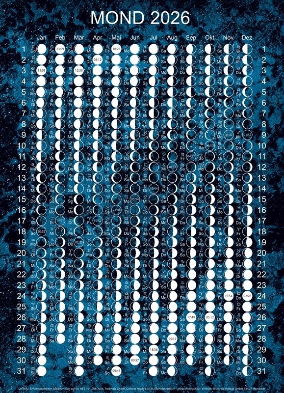 Der Kalender, der die Nacht zum Mittelpunkt des Tages macht! Er zeigt uns den Mondstand an allen Tagen des Jahres, so dass sich die Mondphasen mit einem Blick erfassen lassen.