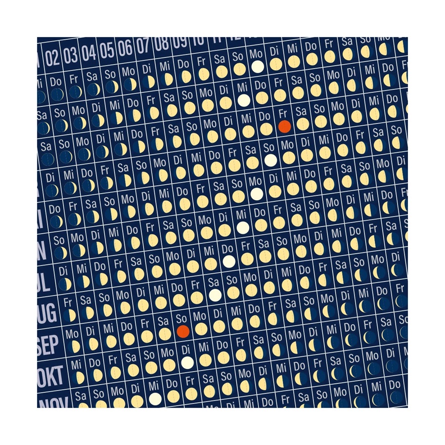 Sehr praktisch, sowohl für Sternfreunde auf der Suche nach Neumond-, wie auch für Romantiker auf der Suche nach Vollmondnächten. Ausnahmsweise ist diese Postkarte nicht zum Basteln, aber dafür finden Sie auf ihr 365 Mondphasen-Bilder, sauber jedem einzelnen Tag des Jahres zugeordnet.